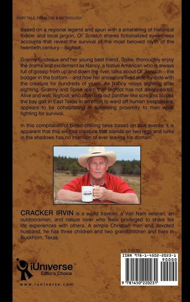 Based on a regional legend and spun with a smattering of historical fodder and local jargon, Ol' Scratch shares fictionalized eyewitness accounts that reveal the survival of the most beloved myth of the twentieth century-Bigfoot. Granny Godeaux and her young best friend, Spike, thoroughly enjoy the drama and excitement as Nancy, a Native American who is always full of gossip from up and down the river, talks about Ol' Scratch-the booger in the bottom-and how her ancestors lived side-by-side with the creature for hundreds of years. As Nancy relays sighting after sighting, Granny and Spike learn that Bigfoot has not disappeared. Alive and well, Bigfoot, who often lets out panther-like screams across the bay in East Texas in an effort to ward off human trespassers, appears to be cohabitating in surprising proximity to man while fighting for survival. In this compilation of blood-chilling tales based on true events, it is apparent that this six-foot creature that stands on two legs and lurks in the shadows has no intention of ever leaving his domain.