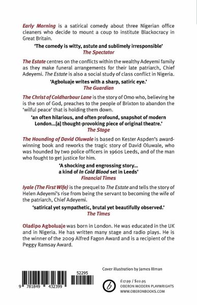 This is the first collection of plays by award-winning playwright Oladipo Agboluaje, a significant force in Black British drama. Described as an "exciting, vital new voice" (Time Out London), Agboluaje demonstrates his versatility to write plays that transcend African and British cultures. Early Morning is a satirical comedy about three Nigerian office cleaners who decide to mount a coup to institute Blackocracy in Great Britain. "The comedy is witty, astute and sublimely irresponsible." - Spectator The Estate centers on the conflicts within the wealthy Adeyemi family as they make funeral arrangements for their late patriarch, Chief Adeyemi. The Estate is also a social study of class conflict in Nigeria. "Agboluaje writes with a sharp, satiric eye." - Guardian The Christ of Coldharbour Lane is the story of Omo who, believing he is the son of God, preaches to the people of Brixton to abandon the "willful peace" that is holding them down. "An often hilarious, and often profound, snapshot of modern London... a] thought-provoking piece of original theatre." - The Stage The Hounding of David Oluwale is based on Kester Aspden's award-winning book and reworks the tragic story of David Oluwale, who was hounded by two police officers in 1960s Leeds, and of the man who fought to get justice for him. "A shocking and engrossing story...a kind of In Cold Blood set in Leeds." - Financial Times Iyale (The First Wife) is the prequel to The Estate and tells the story of Helen Adeyemi's rise from being the servant to becoming the wife of the patriarch, Chief Adeyemi. "Satirical yet sympathetic, brutal yet beautifully observed." - Times (London)