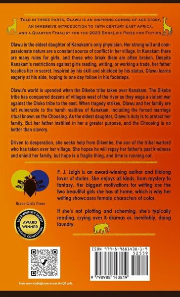 Set in a time and place unburdened by the devastation of colonialism, Olawu is a refreshing tale about a brave girl with a bold dream. Olawu is the eldest daughter of Kanakam's only physician. Her strong will and compassionate nature are a constant source of conflict in her village. In Kanakam there are many rules for girls, and those who break them are often broken. Despite Kanakam's restrictions against girls reading, writing, or working a trade, her father teaches her in secret. Inspired by his skill and shielded by his status, Olawu learns eagerly at his side, hoping to one day follow in his footsteps. Olawu's world is upended when the Dikebe tribe takes over Kanakam. The Dikebe tribe has conquered dozens of villages west of the river as they wage a violent war against the Oloko tribe to the east. When tragedy strikes, Olawu and her family are left vulnerable to the harsh realities of Kanakam, including the forced marriage ritual known as the Choosing. As the eldest daughter, Olawu's duty is to protect her family. But her father instilled in her a greater purpose, and the Choosing is no better than slavery. Driven to desperation, she seeks help from Dikembe, the son of the tribal warlord who has taken over her village. She hopes he will repay her father's past kindness and shield her family, but hope is a fragile thing, and time is running out. Told in three parts, Olawu is an inspiring coming of age story, an immersive introduction to 19th century East Africa, and a Quarter Finalist for the 2023 BookLife Prize for Fiction.