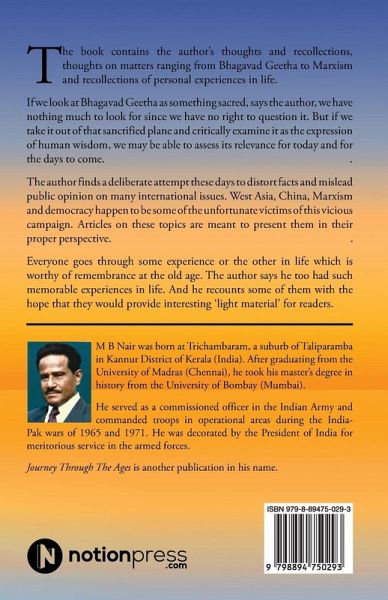 The book contains the author's thoughts and recollections, thoughts on matters ranging from Bhagavad Geetha to Marxism and recollections of personal experiences in life. If we look at Bhagavad Geetha as something sacred, says the author, we have nothing much to look for since we have no right to question it. But if we take it out of that sanctified plane and critically examine it as the expression of human wisdom, we may be able to assess its relevance for today and for the days to come. The author finds a deliberate attempt these days to distort facts and mislead public opinion on many international issues. West Asia, China, Marxism and democracy happen to be some of the unfortunate victims of this vicious campaign. Articles on these topics are meant to present them in their proper perspective. Everyone goes through some experience or the other in life which is worthy of remembrance at the old age. The author says he too had such memorable experiences in life. And he recounts some of them with the hope that they would provide interesting 'light material' for readers.