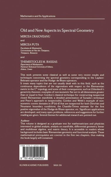 It is known that to any Riemannian manifold (M, g ) , with or without boundary, one can associate certain fundamental objects. Among them are the Laplace-Beltrami opera tor and the Hodge-de Rham operators, which are natural [that is, they commute with the isometries of (M,g)], elliptic, self-adjoint second order differential operators acting on the space of real valued smooth functions on M and the spaces of smooth differential forms on M, respectively. If M is closed, the spectrum of each such operator is an infinite divergent sequence of real numbers, each eigenvalue being repeated according to its finite multiplicity. Spectral Geometry is concerned with the spectra of these operators, also the extent to which these spectra determine the geometry of (M, g) and the topology of M. This problem has been translated by several authors (most notably M. Kac). into the col loquial question "Can one hear the shape of a manifold?" because of its analogy with the wave equation. This terminology was inspired from earlier results of H. Weyl. It is known that the above spectra cannot completely determine either the geometry of (M , g) or the topology of M. For instance, there are examples of pairs of closed Riemannian manifolds with the same spectra corresponding to the Laplace-Beltrami operators, but which differ substantially in their geometry and which are even not homotopically equiva lent.