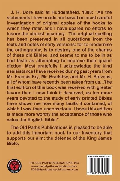 J. R. Dore said at Huddersfield, 1888: "All the statements I have made are based on most careful investigation of original copies of the books to which they refer, and I have spared no efforts to insure the utmost accuracy. The original spelling has been preserved in all quotations from the texts and notes of early versions: for to modernize the orthography, is to destroy one of the charms of these old Bibles, and seems to me to be in as bad taste as attempting to improve their quaint diction. Most gratefully I acknowledge the kind assistance I have received during past years from Mr. Francis Fry, Mr. Bradshaw, and Mr. H. Stevens, all of whom have recently been taken from us...The first edition of this book was received with greater favour than I now think it deserved, as ten more years devoted to the study of early printed Bibles have shown me how many faults it contained, of which I was then unconscious. I hope this edition is made more worthy the acceptance of those who value the English Bible." The Old Paths Publications is pleased to be able to add this important book to our inventory that supports our aim; the defense of the King James Bible.