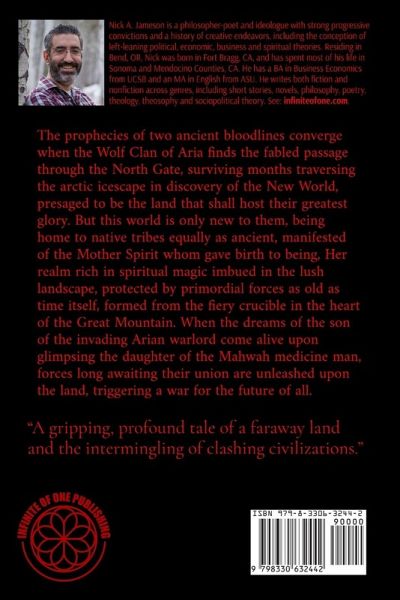 The prophecies of two ancient bloodlines converge when the Wolf Clan of Aria finds the fabled passage through the North Gate, surviving months traversing the arctic icescape in discovery of the New World, presaged to be the land that shall host their greatest glory. But this world is only new to them, being home to native tribes equally as ancient, manifested of the Mother Spirit whom gave birth to being, Her realm rich in spiritual magic imbued in the lush landscape, protected by primordial forces as old as time itself, formed from the fiery crucible in the heart of the Great Mountain. When the dreams of the son of the invading Arian warlord come alive upon glimpsing the daughter of the Mahwah medicine man, forces long awaiting their union are unleashed upon the land, triggering a war for the future of all.