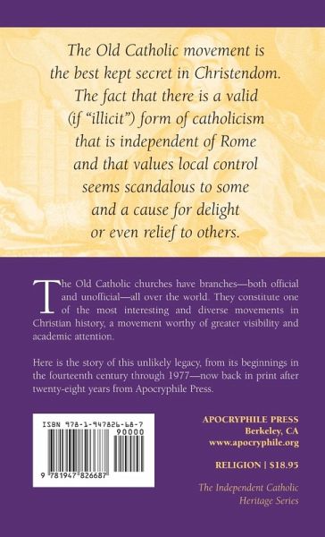 The Old Catholic movement is the best kept secret in Christendom. The fact that there is a valid (if "illicit") form of catholicism that is independent of Rome and which values local control seems scandalous to some and a cause for delight or even relief in others. The Old Catholic churches have branches-both official and unofficial-all over the world. They constitute one of the most interesting and diverse movements in Christian history, a movement worthy of greater visibility and academic attention. Here is the story of this unlikely legacy, from its beginnings in the fourteenth century through 1977-now back in print after twenty-eight years from Apocryphile Press.