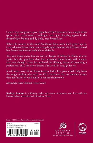 Casey Gray had grown up on legends of Old Christmas Eve, a night when spirits walk, cattle kneel at midnight, and signs of spring appear in the form of elder blooms and fig buds, even beneath ice. When she returns to the small Southeast Texas town she'd grown up in, Casey doesn't dream there can be anything left beneath the ice that covered her former relationship with Kalin McBride. The next thing Casey knows, she's in danger of falling for Kalin all over again, but the problems that had separated them before still remain, and even though Casey has achieved her lifelong dream of becoming a professional chef, she now wonders if that will be enough for her. It will take every bit of determination Kalin has, plus a little help from the magic walking the earth on Old Christmas Eve, to convince Casey that her future lies with Kalin in her little hometown. Sensuality Level: Behind Closed Doors