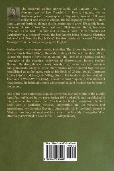 The Reverend Sabine Baring-Gould (28 January 1834 - 2 January 1924) of Lew Trenchard in Devon, England, was an Anglican priest, hagiographer, antiquarian, novelist, folk song collector and eclectic scholar. His bibliography consists of more than 1240 publications, though this list continues to grow. His family home, the manor house of Lew Trenchard, near Okehampton, Devon, has been preserved as he had it rebuilt and is now a hotel. He is remembered particularly as a writer of hymns, the best-known being "Onward, Christian Soldiers" and "Now the Day Is Over". He also translated the carol "Gabriel's Message" from the Basque language to English. Baring-Gould wrote many novels, including The Broom-Squire set in the Devil's Punch Bowl (1896), Mehalah: a story of the salt marshes (1880), Guavas the Tinner (1897), the 16-volume The Lives of the Saints, and the biography of the eccentric poet-vicar of Morwenstow, Robert Stephen Hawker. He also published nearly 200 short stories in assorted magazines and periodicals. Many of these short stories were collected together and republished as anthologies, such as his Book of Ghosts (1904), Dartmoor Idyllys (1896), and In a Quiet Village (1900). His folkloric studies resulted in The Book of Were-Wolves (1865), one of the most frequently cited studies of lycanthropy. He habitually wrote while standing, and his desk can be seen in the manor. One of his most enduringly popular works was Curious Myths of the Middle Ages, first published in two parts during 1866 and 1868, and republished in many other editions since then. "Each of the book's twenty-four chapters deals with a particular medieval superstition and its variants and antecedents," writes critic Steven J. Mariconda. H. P. Lovecraft termed it "that curious body of medieval lore which the late Mr. Baring-Gould so effectively assembled in book form." … (wikipedia.org)