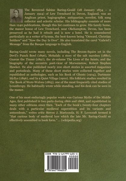 The Reverend Sabine Baring-Gould (28 January 1834 - 2 January 1924) of Lew Trenchard in Devon, England, was an Anglican priest, hagiographer, antiquarian, novelist, folk song collector and eclectic scholar. His bibliography consists of more than 1240 publications, though this list continues to grow. His family home, the manor house of Lew Trenchard, near Okehampton, Devon, has been preserved as he had it rebuilt and is now a hotel. He is remembered particularly as a writer of hymns, the best-known being "Onward, Christian Soldiers" and "Now the Day Is Over". He also translated the carol "Gabriel's Message" from the Basque language to English. Baring-Gould wrote many novels, including The Broom-Squire set in the Devil's Punch Bowl (1896), Mehalah: a story of the salt marshes (1880), Guavas the Tinner (1897), the 16-volume The Lives of the Saints, and the biography of the eccentric poet-vicar of Morwenstow, Robert Stephen Hawker. He also published nearly 200 short stories in assorted magazines and periodicals. Many of these short stories were collected together and republished as anthologies, such as his Book of Ghosts (1904), Dartmoor Idyllys (1896), and In a Quiet Village (1900). His folkloric studies resulted in The Book of Were-Wolves (1865), one of the most frequently cited studies of lycanthropy. He habitually wrote while standing, and his desk can be seen in the manor. One of his most enduringly popular works was Curious Myths of the Middle Ages, first published in two parts during 1866 and 1868, and republished in many other editions since then. "Each of the book's twenty-four chapters deals with a particular medieval superstition and its variants and antecedents," writes critic Steven J. Mariconda. H. P. Lovecraft termed it "that curious body of medieval lore which the late Mr. Baring-Gould so effectively assembled in book form." ... (wikipedia.org)