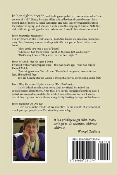 In her eighth decade, and feeling compelled to comment on what "she got out of it all," Nancy Parsons offers this collection of casual essays. It's a mixed dish of memoir, social comment, and rant, loosely organized around the subject of aging, and seasoned with a healthy helping of humor. With the right attitude, growing older is an adventure. It would be a shame to miss it.