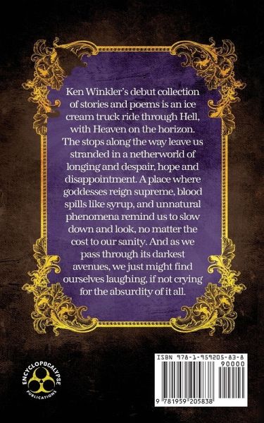 Ken Winkler's debut collection of stories and poems is an ice cream truck ride through Hell, with Heaven on the horizon. The stops along the way leave us stranded in a netherworld of longing and despair, hope and disappointment. A place where goddesses reign supreme, blood spills like syrup, and unnatural phenomena remind us to slow down and look, no matter the cost to our sanity. And as we pass through its darkest avenues, we just might find ourselves laughing, if not crying for the absurdity of it all.