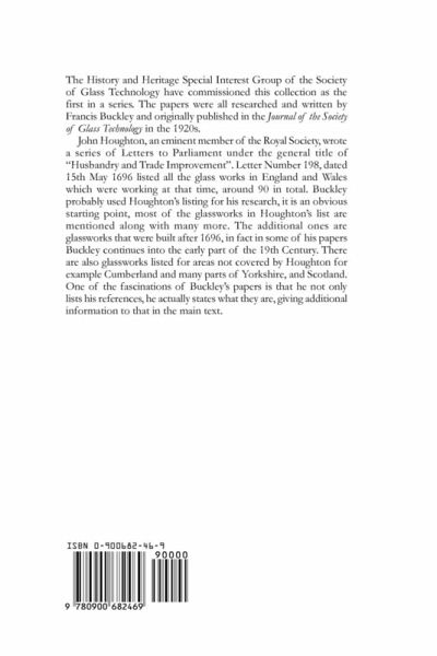 This is a collection of papers researched and written by Francis Buckley and originally published in the Journal of the Society of Glass Technology in the 1920s. Each chapter gives details of glass making factories around the UK from the late 17th century to the early 19th. John Houghton, an eminent member of the Royal Society, wrote a series of Letters to Parliament under the general title of "Husbandry and Trade Improvement". Letter Number 198, dated 15th May 1696 listed all the glass works in England and Wales which were working at that time, around 90 in total. Buckley probably used Houghton's listing for his research, it is an obvious starting point, most of the glassworks in Houghton's list are mentioned along with many more. The additional ones are glassworks that were built after 1696, in fact in some of his papers Buckley continues into the early part of the 19th Century. There are also glassworks listed for areas not covered by Houghton for example Cumberland and many parts of Yorkshire, and Scotland. One of the fascinations of Buckley's papers is that he not only lists his references, he actually states what they are, giving additional information to that in the main text.