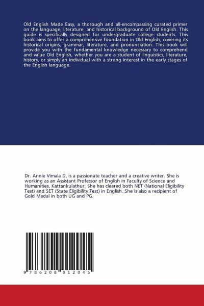 Old English Made Easy, a thorough and all-encompassing curated primer on the language, literature, and historical background of Old English. This guide is specifically designed for undergraduate college students. This book aims to offer a comprehensive foundation in Old English, covering its historical origins, grammar, literature, and pronunciation. This book will provide you with the fundamental knowledge necessary to comprehend and value Old English, whether you are a student of linguistics, literature, history, or simply an individual with a strong interest in the early stages of the English language.