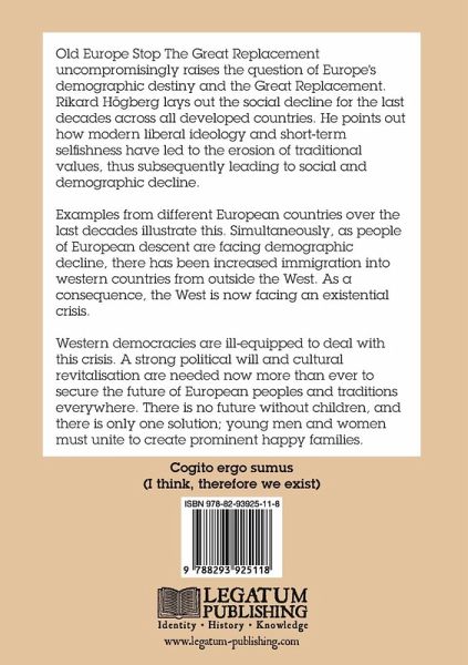 This book uncompromisingly brings up the question of the demographic destiny of Europe and the Great Replacement. Rikard Högberg lays out the social decline for the last decades across all developed countries. He points out how modern liberal ideology and short-term selfishness have led to the erosion of traditional values, thus subsequently leading to social and demographic decline. This is illustrated with examples from different European countries over the last decades. Simultaneously, as people of European descent are facing demographic decline, there has been increased immigration into western countries from outside the West. As a consequence, the West is now facing an existential crisis. A crisis that western democracies are ill-equipped to deal with. A strong political will and cultural revitalisation are needed now more than ever to secure the future of European peoples and traditions everywhere. There is no future without children, and there is only one solution; young men and women must unite to create prominent happy families.