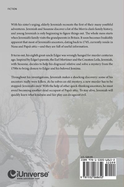 With his sister's urging, elderly Jeremiah recounts the first of their many youthful adventures. Jeremiah and Susanne discover a lot of the Morris clan's family history, and young Jeremiah is only beginning to figure things out. The whole mess starts when Jeremiah's family visits the grandparents in Britain. It soon becomes freakishly apparent that most of Jeremiah's ancestors, dating back to 1745, currently reside in Nana and Papa's attic-and they are full of useful information. It turns out, his eighth great-uncle Edgar was wrongly hanged for murder centuries ago. Inspired by Edgar's parents, the Earl Mortimer and the Countess Leila, Jeremiah, with Susanne, decides to help his disgraced relative and solve a mystery from the 1700s to bring closure to Edgar and his beloved Jemima. Throughout his investigations, Jeremiah makes a shocking discovery: some of his ancestors really were killers. As he solves an old mystery, a new murder has to be stopped: Jeremiah's own! With the help of other quick-thinking ancestors, he must avoid becoming another dead occupant of Papa's attic. To stay alive, Jeremiah will quickly learn what kindness and fair play can do against evil.