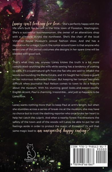 Lose yourself in the magical forests and charming towns of the Pacific Northwest, where picturesque Victorian homes hide mysteries spanning decades, faeries watch from the trees, and romance awaits... for those bold enough to seek it. Laney isn't looking for love. She's perfectly happy with the life she's built for herself in the little town of Foreston, Washington. She's a successful businesswoman, the owner of an alterations shop with a clientele across the northwest. She's the chair of the local Victorian house museum's annual fashion show. And she has a reputation for a magic touch: the rumor around town is that anyone who wears one of the period costumes she designs in her spare time will be blessed with good luck. That's what they say, anyway. Laney knows the truth is a bit more complicated-anything she wills while sewing has a tendency of coming to pass. It's a supernatural gift from the fae who are said to inhabit the woods surrounding the Paine Estate, and it's taught her to keep a guard on her notorious redheaded temper. But keeping her temper becomes difficult when journalist Paul Nelson comes to town to do a feature about the museum. With his stunning good looks and swoon-worthy English accent, Paul is charming, irresistible... and just so happens to be Laney's ex. Laney wants nothing more than to keep Paul at arm's length, but when she stumbles across a series of break-ins at the museum, she may have no choice but to trust the dashing reporter who once broke her heart to help her catch the culprit. And when a nearby forest fire threatens the safety of the town-and of the woods-will Laney be able to put her old feelings aside in order to protect the magic of Foreston? Or will that same magic lead to an unexpected happy ending?