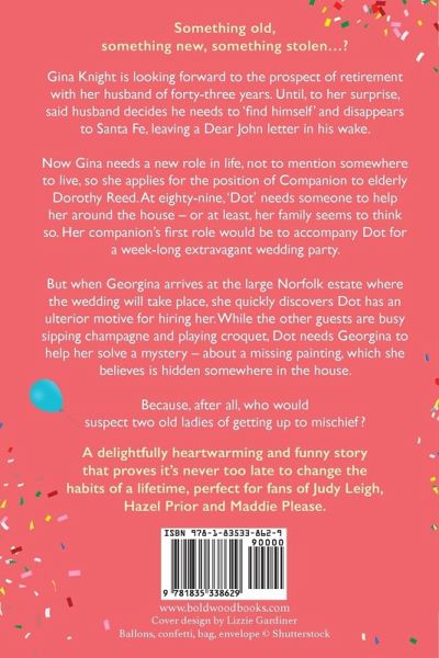 A delightfully heartwarming and funny story that proves it's never too late to change the habits of a lifetime, perfect for fans of Judy Leigh, Hazel Prior and Maddie Please. Something old, something new, something stolen...? Gina Knight is looking forward to the prospect of retirement with her husband of forty-three years. Until, to her surprise, said husband decides he needs to 'find himself' - alone - and disappears to Santa Fe, leaving a Dear John letter in his wake. Now Gina needs a new role in life, not to mention somewhere to live, so she applies for the position of Companion to elderly Dorothy Reed. At eighty-nine, 'Dot' needs someone to help her around the house - or at least, her family seems to think so. Her companion's first role would be to accompany Dot for a week-long extravagant wedding party. But when Gina arrives at the large Norfolk estate where the wedding will take place, she quickly discovers Dot has an ulterior motive for hiring her. While the other guests are busy sipping champagne and playing croquet, Dot needs Georgina to help her solve a mystery - about a missing painting, which she believes is hidden somewhere in the house. Because, after all, who would suspect two old ladies of getting up to mischief? Praise for Kate Galley's books: 'An uplifting, positive story... Eat Pray Love for the older generation' Judy Leigh 'I thoroughly enjoyed this poignant and heartwarming debut!' Fiona Gibson 'I loved this book! I wouldn't have thought it was a debut novel, it was so well-written. I loved the author's style and also the pace of the story', NetGalley Reviewer, ⭐⭐⭐⭐⭐ 'The perfect holiday read! I'll be looking for more books by Kate Galley in the future', NetGalley Reviewer, ⭐⭐⭐⭐⭐ 'Wonderful story about friendships, second chances, and what ultimately can make life feel worth living', NetGalley Reviewer ⭐⭐⭐⭐⭐ 'Sad, funny and uplifting. I really think we need a sequel to this one!', NetGalley Reviewer 'Wonderfully fluent and evocative writing, complemented this beautifully textured, fast-paced, multi-layered storyline... This story was definitely one of a kind', NetGalley Reviewer, ⭐⭐⭐⭐⭐