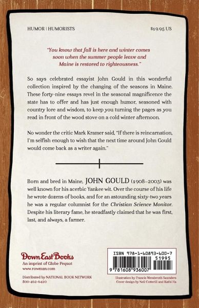 "You know that fall is here and winter comes soon when the summer people leave and Maine is restored to righteousness." So says celebrated essayist John Gould in this wonderful collection inspired by the changing of the seasons in Maine. These forty-nine essays revel in the seasonal magnificence the state has to offer and offer just enough humor, seasoned with country lore and wisdom to keep you turning the pages as you read in front of the wood stove on a cold winter afternoon. No wonder the critic Mark Kramer said, "If there is reincarnation, I'm selfish enough to wish that the next time around John Gould would come back as a writer again."