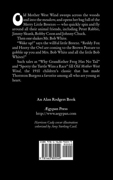 Old Mother West Wind sweeps across the woods and into the meadow, and opens her bag full of the Merry Little Breezes -- who quickly spin and fly around all their animal friends, including Peter Rabbit, Jimmy Skunk, Bobby Coon and Johnny Chuck. Then one shakes Mr. Bob White. "Wake up!" says the willful little Breeze. "Reddy Fox and Hooty the Owl are coming to the Brown Pasture to gobble up you and Mrs. Bob White and all the little Bob Whites!"