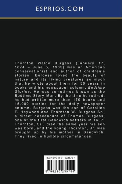 Thornton W. Burgess (1874-1965) was a well-known American author, naturalist, and conservationist. Born in Massachusetts, Burgess developed a love of nature from an early age and spent much of his childhood exploring the woods and fields around his home. After completing his education, Burgess worked as a newspaper reporter and eventually turned to writing children's books. His first book, "Old Mother West Wind," was published in 1910 and was an instant success. This was followed by a series of books featuring a cast of animal characters, including "The Adventures of Peter Cottontail," "The Adventures of Sammy Jay," and "The Adventures of Jimmy Skunk." Burgess was also a passionate conservationist and used his writing to promote awareness of the importance of protecting the natural world. He was a strong advocate for the preservation of wildlife habitats and helped to establish several wildlife sanctuaries in Massachusetts. In addition to his writing and conservation work, Burgess was also a respected naturalist and photographer. He traveled extensively throughout North America, studying and documenting a wide variety of animal species. Thornton W. Burgess's books have been beloved by generations of children and continue to be popular today. His legacy as a writer, naturalist, and conservationist has had a lasting impact on the field of children's literature and the world of wildlife conservation.