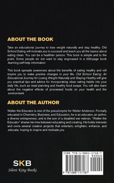 Take an educational journey to lose weight naturally and stay healthy. Old School Eating will motivate you to succeed and teach you all the basics about eating clean. You can be a healthier person. This book is simple and to the point. Some people do not want to stay engrossed in a 500-page book learning self-help information. This book spreads awareness about the benefits of eating healthy and will inspire you to make positive changes in your life. Old School Eating: An Educational Journey for Losing Weight Naturally and Staying Healthy will give you practical tips and advice for incorporating clean eating habits into your daily life, such as meal planning and healthy food swaps. You will also learn about the negative effects of processed foods on your health and the environment. Walter the Educator is one of the pseudonyms for Walter Anderson. Formally educated in Chemistry, Business, and Education, he is an educator, an author, a diverse entrepreneur, and is the son of a disabled war veteran. "Walter the Educator" shares his time between educating and creating. He holds interests and owns several creative projects that entertain, enlighten, enhance, and educate, hoping to inspire and motivate you.