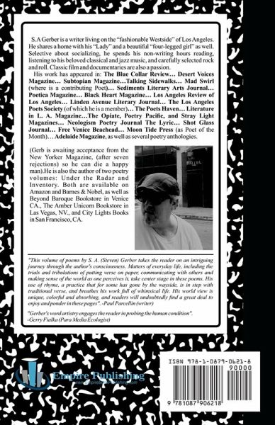 "This volume of poems by S. A. (Steven) Gerber takes the reader on an intriguing journey through the author's consciousness. Matters of everyday life, including the trials and tribulations of putting verse on paper, communicating with others and making sense of the world as one perceives it, take center stage in these poems. His use of rhyme, a practice that for some has gone by the wayside, is in step with traditional verse, and breathes his work full of whimsical life. His world view is unique, colorful and absorbing, and readers will undoubtedly find a great deal to enjoy and ponder in these pages" S.A Gerber is a writer living on the "fashionable Westside" of Los Angeles. He shares a home with his "Lady" and a beautiful "four-legged girl" as well. Selective about socializing, he spends his non-writing hours reading, listening to his beloved classical and jazz music, and carefully selected rock and roll. Classic film and documentaries are also a passion. His work has appeared in: The Blue Collar Review... Desert Voices Magazine... Subtopian Magazine...Talking Sidewalks... Mad Swirl (where is a contributing Poet)... Sediments Literary Arts Journal... Poetica Magazine... Black Heart Magazine... Los Angeles Review of Los Angeles... Linden Avenue Literary Journal... The Los Angeles Poets Society (of which he is a member)... The Poets Haven... Literature in L. A. Magazine...The Opiate, Poetry Pacific, and Stray Light Magazines... Neologism Poetry Journal The Lyric... Shot Glass Journal... Free Venice Beachead... Moon Tide Press (as Poet of the Month)... Adelaide Magazine, as well as several poetry anthologies.