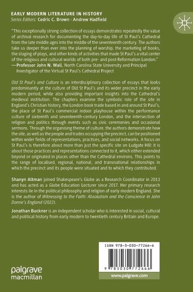Old St Paul's and Culture is an interdisciplinary collection of essays that looks predominantly at the culture of Old St Paul's and its wider precinct in the early modern period, while also providing important insights into the Cathedral's medieval institution. The chapters examine the symbolic role of the site in England's Christian history, the London book trade based in and around St Paul's, the place of St Paul's commercial indoor playhouse within the performance culture of sixteenth and seventeenth-century London, and the intersection of religion and politics through events such as civic ceremonies and occasional sermons. Through the organising theme of culture, the authors demonstrate how the site, as well as the people and trades occupying the precinct, can be positioned within wider fields of representations, practices, and social networks. A focus on St Paul's is therefore about more than just the specific site on Ludgate Hill: it is about those practices and representations connected to it, which either extended beyond or originated in places other than the Cathedral environs. This points to the range of localised, regional, national, and transnational relationships in which the precinct and its people were situated and to which they contributed.