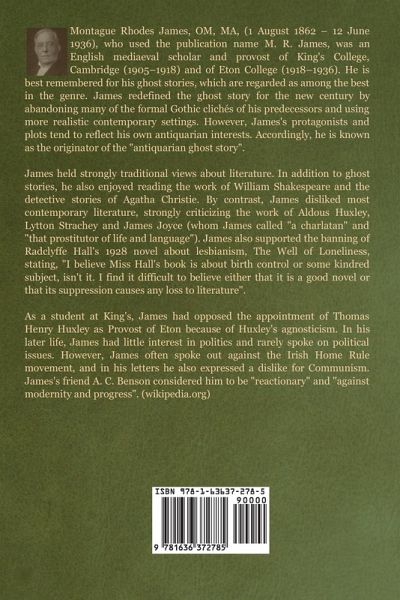 Montague Rhodes James OM FBA (1 August 1862 - 12 June 1936) was an English author, medievalist scholar and provost of King's College, Cambridge (1905-1918), and of Eton College (1918-1936). He was Vice-Chancellor of the University of Cambridge (1913-15). Though James's work as a medievalist and scholar is still highly regarded, he is best remembered for his ghost stories, which some regard as among the best in the genre. James redefined the ghost story for the new century by abandoning many of the formal Gothic clichés of his predecessors and using more realistic contemporary settings. However, James's protagonists and plots tend to reflect his own antiquarian interests. Accordingly, he is known as the originator of the "antiquarian ghost story". (wikipedia.org)