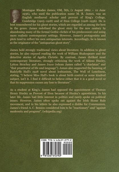 Montague Rhodes James OM FBA (1 August 1862 - 12 June 1936) was an English author, medievalist scholar and provost of King's College, Cambridge (1905-1918), and of Eton College (1918-1936). He was Vice-Chancellor of the University of Cambridge (1913-15). Though James's work as a medievalist and scholar is still highly regarded, he is best remembered for his ghost stories, which some regard as among the best in the genre. James redefined the ghost story for the new century by abandoning many of the formal Gothic clichés of his predecessors and using more realistic contemporary settings. However, James's protagonists and plots tend to reflect his own antiquarian interests. Accordingly, he is known as the originator of the "antiquarian ghost story". (wikipedia.org)