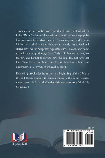 This book unequivocally reveals the biblical truth that Jesus Christ is the ONLY Saviour of the world and clearly refutes the popular but erroneous belief that there are "many ways to God". Jesus Christ if exclusive! He and He alone is the only way to God and eternal life. As the Scriptures explicitly state: "No one can come to the Father except through Jesus Christ. He that has the Son, has that life, and he that does NOT have the Son, does not have that life. There is salvation in no one else; for there is no other name under heaven . . . by which we must be saved.! Following prophecies from the very beginning of the Bible to the end (from creation to consummation), the author clearly underscores this fact as the "undeniable proclamation of the Holy Scriptures"!
