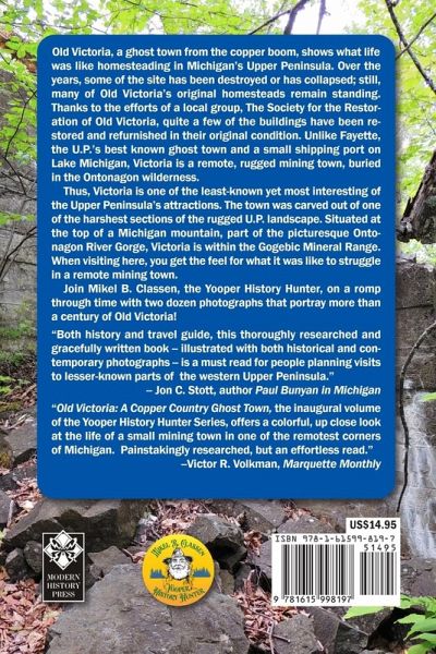 Old Victoria, a ghost town from the copper boom, shows what life was like homesteading in Michigan's Upper Peninsula. Over the years, some of the site has been destroyed or has collapsed; still, many of Old Victoria's original homesteads remain standing. Thanks to the efforts of a local group, The Society for the Restoration of Old Victoria, quite a few of the buildings have been restored and refurnished in their original condition. Unlike Fayette, the U.P.'s best-known ghost town and a small shipping port on Lake Michigan, Victoria is a remote, rugged mining town, buried in the Ontonagon wilderness. Thus, Victoria is one of the least-known yet most interesting attractions of the Upper Peninsula. The town was carved out of one of the harshest sections of the rugged U.P. landscape. Situated at the top of a Michigan mountain, part of the picturesque Ontonagon River Gorge, Victoria is within the Gogebic Mineral Range. When visiting here, you get the feel for what it was like to struggle in a remote mining town. Join Mikel B. Classen, the Yooper History Hunter, on a romp through time with two dozen photographs that portray more than a century of Old Victoria! "Mikel B. Classen couldn't have chosen a more interesting subject for the inaugural volume than the ghost town of Victoria." -- Tom Powers, Michigan in Books "Both history and travel guide, this thoroughly researched and gracefully written book -- illustrated with both historical and contemporary photographs -- is a must-read for people planning visits to lesser-known parts of the western Upper Peninsula." -- Jon C. Stott, author Paul Bunyan in Michigan "Old Victoria: A Copper Country Ghost Town, the inaugural volume of the Yooper History Hunter Series, offers a colorful, up-close look at the life of a small mining town in one of the remotest corners of Michigan. Painstakingly researched, but an effortless read." --Victor R. Volkman, Marquette Monthly Learn more at www.MikelBClassen.com From Modern History Press www.ModernHistoryPress.com