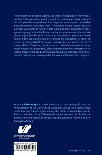 The phenomena of global ageing and intensive population movements overlap. Both migrants and older people are heterogeneous groups and this multiplied heterogeneity of older migrants causes them to be invisible when gathering various data types. Their needs are not recognised, leaving them vulnerable to human rights violations. Thus, migration in older age and ageing outside the home country are also issues of international human rights law. However, older migrants often escape international human rights regulations and determining the obligations of states to respect, protect and fulfil the human rights of older people "on the move" is very difficult. Therefore, this book aims to identify international norms protecting (at least potentially) older migrants and indicate interpretative tools to improve the ability of international human rights law, and consequently, national laws, to respond to the vulnerabilities of older migrants.