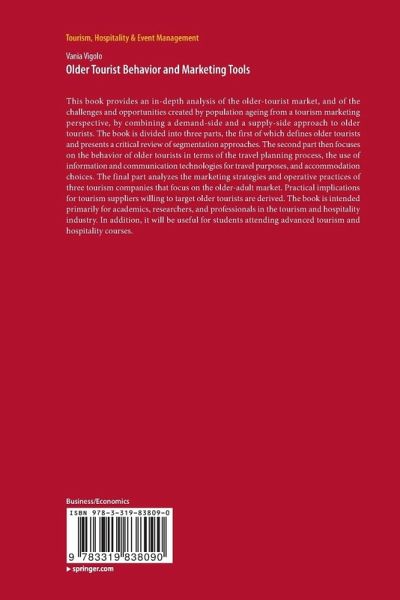 This book provides an in-depth analysis of the older-tourist market, and of the challenges and opportunities created by population ageing from a tourism marketing perspective, by combining a demand-side and a supply-side approach to older tourists. The book is divided into three parts, the first of which defines older tourists and presents a critical review of segmentation approaches. The second part then focuses on the behavior of older tourists in terms of the travel planning process, the use of information and communication technologies for travel purposes, and accommodation choices. The final part analyzes the marketing strategies and operative practices of three tourism companies that focus on the older-adult market. Practical implications for tourism suppliers willing to target older tourists are derived. The book is intended primarily for academics, researchers, and professionals in the tourism and hospitality industry. In addition, it will be useful for students attendingadvanced tourism and hospitality courses.