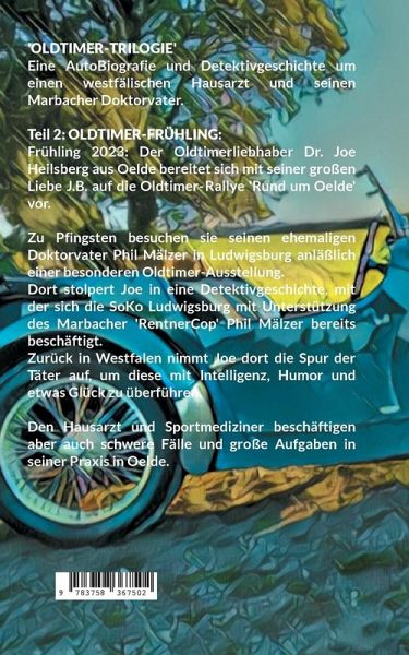 Frühling 2023: Der Oldtimerliebhaber Dr. Joe Heilsberg aus Oelde bereitet sich mit seiner großen Liebe J.B. auf die Oldtimer-Rallye 'Rund um Oelde' vor.Zu Pfingsten besuchen sie seinen ehemaligen Doktorvater Phil Mälzer in Ludwigsburg zu einer besonderen Oldtimer-Ausstellung.Dort stolpert Joe in eine Detektivgeschichte, mit der sich die SoKo Ludwigsburg mit Unterstützung des Marbacher Rentner-Cop Phil bereits beschäftigt.Zurück in Westfalen nimmt er dort die Spur der Täter auf, um diese mit Intelligenz, Humor und etwas Glück zu überführen.Den Hausarzt und Sportmediziner beschäftigen aber auch schwere Fälle und große Aufgaben in seiner Praxis in Oelde.