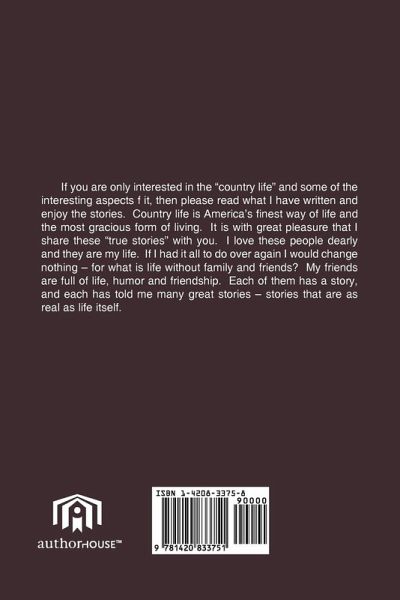If you are only interested in the "country life" and some of the interesting aspects f it, then please read what I have written and enjoy the stories. Country life is America's finest way of life and the most gracious form of living. It is with great pleasure that I share these "true stories" with you. I love these people dearly and they are my life. If I had it all to do over again I would change nothing - for what is life without family and friends? My friends are full of life, humor and friendship. Each of them has a story, and each has told me many great stories - stories that are as real as life itself.