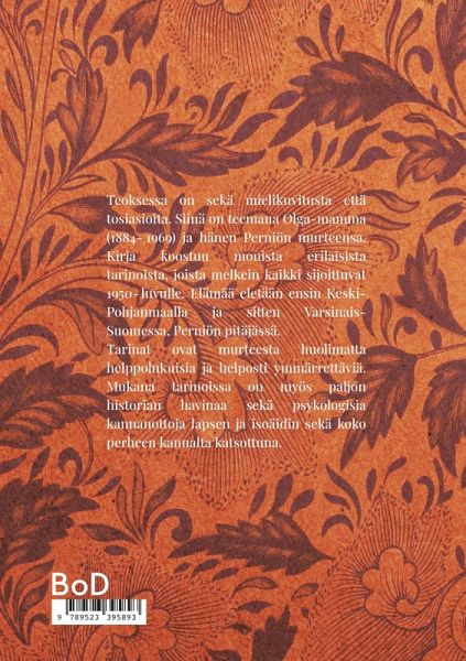 Teoksessa on sekä mielikuvitusta että tosiasioita. Siinä on teemana Olga-mamma (1884-1969) ja hänen Perniön murteensa. Kirja koostuu monista erilaisista tarinoista, joista melkein kaikki sijoittuvat 1950-luvulle. Elämää eletään ensin Keski-Pohjanmaalla ja sitten Varsinais-Suomessa, Perniön pitäjässä. Tarinat ovat murteesta huolimatta helppolukuisia ja helposti ymmärrettäviä. Mukana tarinoissa on myös paljon historian havinaa sekä psykologisia kannanottoja lapsen ja isoäidin sekä koko perheen kannalta katsottuna.