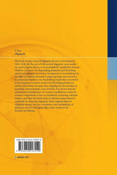 The book focuses classical oligopoly theory as developed in 1840-1940. By the end of this period oligopoly came under the spell of game theory in its probabilistic equilibrium format. Work by Cournot, von Stackelberg, Palander, and Hotelling, causal and dynamic in essence, but ignored, is reconsidered in the light of modern dynamics using topology and numerics. As particular features, von Stackelberg leadership is included in the dynamic Cournot model, the Hotelling problem is solved with elastic demand, thus skipping the absurd idea of quadratic transportation costs. Further, it is shown that the celebrated destabilisation of Cournot equilibrium under increased competition is due to mistakenly assuming constant returns, and that the whole idea of rational expectations is untenable in dynamic oligopoly. Early original ideas in oligopoly theory, such as coexistence and multiplicity of attractors are focused again after many undeserved decades of oblivion.
