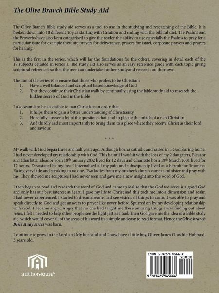 The Olive Branch Bible Study Aid The Olive Branch Bible study aid serves as a tool to use in the studying and researching of the Bible. It is broken down into 18 different Topics starting with Creation and ending with the biblical diet. The Psalms and the Proverbs have also been categorised to give the reader the ability to use especially the Psalms to pray for a particular issue for example there are prayers for deliverance, prayers for Israel, corporate prayers and prayers for healing. This is the first in the series, which will lay the foundations for the others, covering in detail each of the 17 subjects detailed in series 1. The study aid also serves as an easy reference guide with each topic giving scriptural references so that the user can undertake further study and research on their own. The aim of the series to ensure that those who profess to be Christians will 1. Have a well balanced and scriptural based knowledge of God 2. That they continue their Christian walk by continually using the bible study aid to research the hidden secrets of God in the Bible I also want it to be accessible to non Christians in order that 1. It helps them to gain a better understanding of Christianity 2. Hopefully answer a lot of the questions that tend to plaque the minds of a non Christian 3. And thirdly and most importantly to bring them to a place where they receive Christ as their lord and saviour.