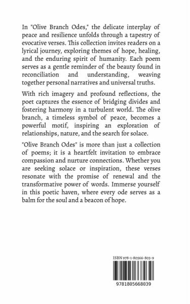 In "Olive Branch Odes," the delicate interplay of peace and resilience unfolds through a tapestry of evocative verses. This collection invites readers on a lyrical journey, exploring themes of hope, healing, and the enduring spirit of humanity. Each poem serves as a gentle reminder of the beauty found in reconciliation and understanding, weaving together personal narratives and universal truths. With rich imagery and profound reflections, the poet captures the essence of bridging divides and fostering harmony in a turbulent world. The olive branch, a timeless symbol of peace, becomes a powerful motif, inspiring an exploration of relationships, nature, and the search for solace. "Olive Branch Odes" is more than just a collection of poems; it is a heartfelt invitation to embrace compassion and nurture connections. Whether you are seeking solace or inspiration, these verses resonate with the promise of renewal and the transformative power of words. Immerse yourself in this poetic haven, where every ode serves as a balm for the soul and a beacon of hope.