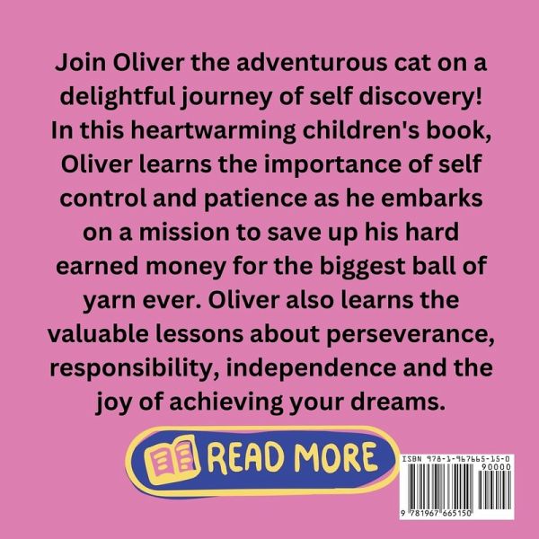 Join Oliver the adventurous cat on a delightful journey of self discovery! In this heartwarming children's book, Oliver learns the importance of self control and patience as he embarks on a mission to save up his hard earned money for the biggest ball of yarn ever. Oliver also learns the valuable lessons about perseverance, responsibility, independence and the joy of achieving your dreams.