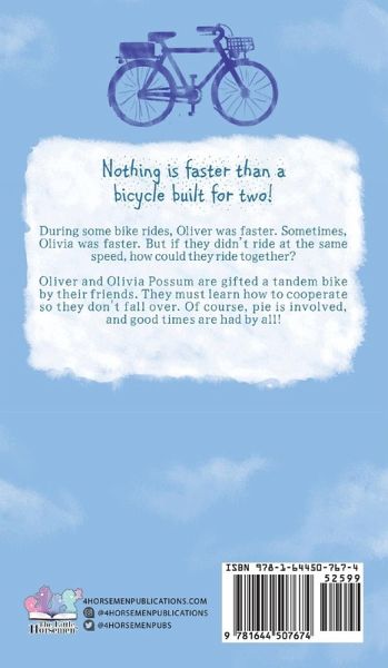 Nothing is faster than a bicycle built for two! During some bike rides, Oliver was faster. Sometimes, Olivia was faster. But if they didn't ride at the same speed, how could they ride together? Oliver and Olivia Possum are gifted a tandem bike by their friends. They must learn how to cooperate so they don't fall over. Of course, pie is involved, and good times are had by all!