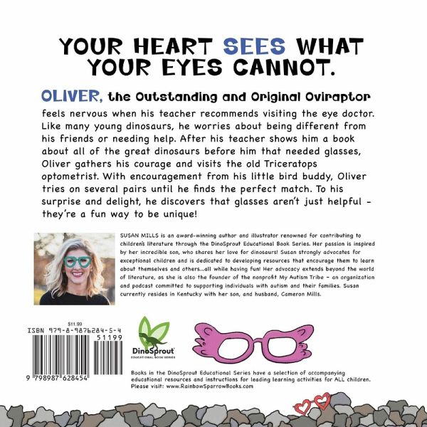 Oliver, the Outstanding and Original Oviraptor feels nervous when his teacher recommends visiting the eye doctor. Like many young dinosaurs, he worries about being different from his friends or needing help. After his teacher shows him a book about all of the great dinosaurs before him that needed glasses, Oliver gathers his courage and visits the old Triceratops optometrist. With encouragement from. his little bird buddy, Oliver tries on several pairs until he finds the perfect match. To his surprise and delight, he discovers that glasses aren't just helpful - they're a fun way to be unique!