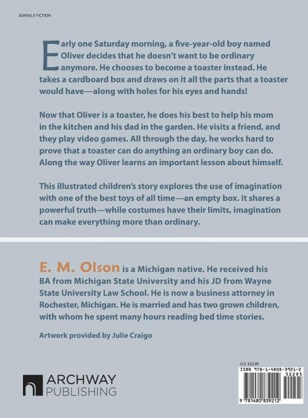 Early one Saturday morning, a five-year-old boy named Oliver decides that he doesn't want to be ordinary anymore. He chooses to become a toaster instead. He takes a cardboard box and draws on it all the parts that a toaster would have-along with holes for his eyes and hands! Now that Oliver is a toaster, he does his best to help his mom in the kitchen and his dad in the garden. He visits a friend, and they play video games. All through the day, he works hard to prove that a toaster can do anything an ordinary boy can do. Along the way Oliver learns an important lesson about himself. This illustrated children's story explores the use of imagination with one of the best toys of all time-an empty box. It shares a powerful truth-while costumes have their limits, imagination can make everything more than ordinary.