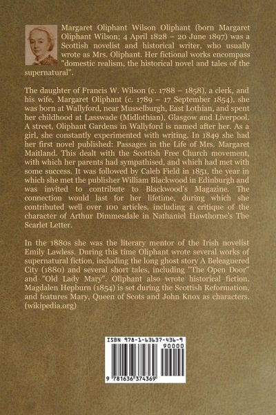 Margaret Oliphant Wilson Oliphant (born Margaret Oliphant Wilson; 4 April 1828 - 20 June 1897) was a Scottish novelist and historical writer, who usually wrote as Mrs. Oliphant. Her fictional works encompass "domestic realism, the historical novel and tales of the supernatural". The daughter of Francis W. Wilson (c. 1788 - 1858), a clerk, and his wife, Margaret Oliphant (c. 1789 - 17 September 1854), she was born at Wallyford, near Musselburgh, East Lothian, and spent her childhood at Lasswade (Midlothian), Glasgow and Liverpool. A street, Oliphant Gardens in Wallyford is named after her. As a girl, she constantly experimented with writing. In 1849 she had her first novel published: Passages in the Life of Mrs. Margaret Maitland. This dealt with the Scottish Free Church movement, with which her parents had sympathised, and which had met with some success. It was followed by Caleb Field in 1851, the year in which she met the publisher William Blackwood in Edinburgh and was invited to contribute to Blackwood's Magazine. The connection would last for her lifetime, during which she contributed well over 100 articles, including a critique of the character of Arthur Dimmesdale in Nathaniel Hawthorne's The Scarlet Letter. In the 1880s she was the literary mentor of the Irish novelist Emily Lawless. During this time Oliphant wrote several works of supernatural fiction, including the long ghost story A Beleaguered City (1880) and several short tales, including "The Open Door" and "Old Lady Mary". Oliphant also wrote historical fiction. Magdalen Hepburn (1854) is set during the Scottish Reformation, and features Mary, Queen of Scots and John Knox as characters. (wikipedia.org)
