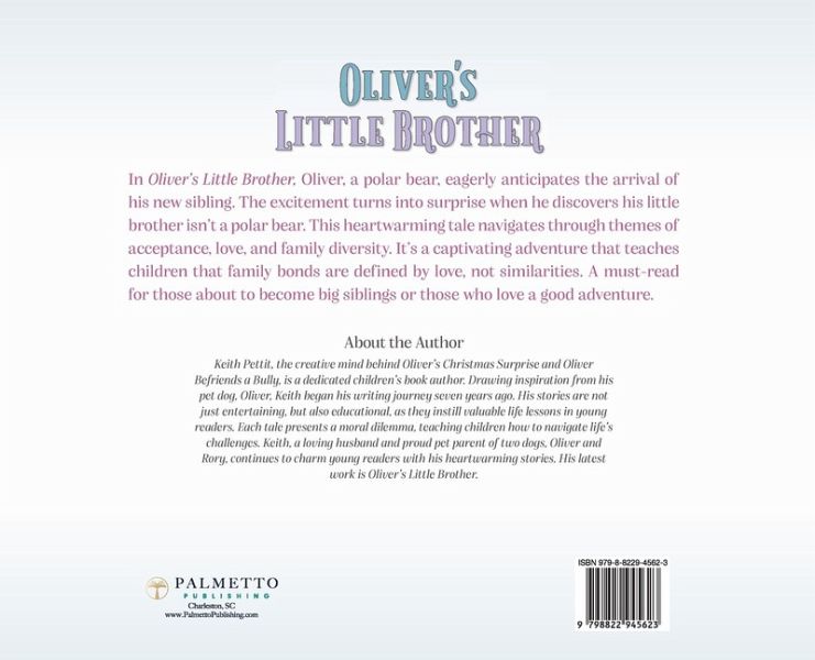 Join the Exciting Journey of a Big Brother's Surprise: A Tale of Unexpected Family Bonds and the Mystery of a Non-Polar Bear Sibling! In Oliver's Little Brother, Oliver's adventures take a thrilling turn as he prepares to meet his newest family member. This heartwarming story is about the anticipation, excitement, and surprises that come with welcoming a new sibling into the family. Oliver, a charming and curious polar bear, is thrilled to become a big brother. He imagines all the fun he will have, teaching his little brother how to catch fish, slide on ice, and navigate the vast Arctic wilderness. But there's a twist that Oliver doesn't see coming - his little brother isn't a polar bear!This delightful tale takes young readers on a journey through Oliver's range of emotions as he navigates this unexpected revelation. It's a story that explores the themes of acceptance, love, and the true meaning of family. It teaches children that family bonds are not defined by similarities but by the love and care we have for each other. As Oliver learns to embrace the differences between him and his little brother, he realizes that their bond is stronger than he ever imagined. This story will leave children with a sense of wonder and a deeper understanding of family diversity. Oliver's Little Brother is a captivating story that will engage children with its charming characters, unexpected plot twist, and heartwarming message. It's a must-read for children who are about to become big brothers or sisters, or for those who simply love a good adventure story. This book is not just a story; it's an experience that will leave a lasting impact on young readers. It's a celebration of family, love, and the joy of being a big brother. So, join Oliver on his exciting journey and discover what it truly means to be a family.