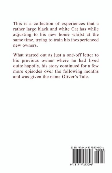 This is a collection of experiences that a rather large black and white Cat has while adjusting to his new home whilst at the same time, trying to train his inexperienced new owners. What started out as just a one-off letter to his previous owner where he had lived quite happily, his story continued for a few more episodes over the following months and was given the name Oliver's Tale.