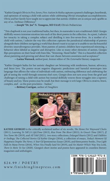 Kathie Giorgio was forty years old when she gave birth to the baby she and her husband, Michael, planned for, hoped for, dreamed of. But Olivia wasn't anyone this veteran mother of three teenagers expected. Olivia cried all the time. She wouldn't eat table food. She wouldn't speak. Her favorite toy was a bucket of hundreds of tiny plastic bears in rainbow colors that she spent hours every day arranging in a long looping line through the house. And finally...she was diagnosed as autistic when she was three years old. Kathie and Michael, both writers, were told that their daughter would never have words, and that she would only see them as "bumps on a log". Yet she smiled at them every day. Olivia In Five, Seven, Five; Autism In Haiku is the story, in poetic form, of a mother's love for her autistic child, and the way that love could blast through a diagnosis and lift this little girl who smiled. Kathie smiled back.
