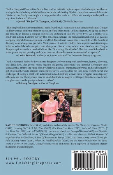 Kathie Giorgio was forty years old when she gave birth to the baby she and her husband, Michael, planned for, hoped for, dreamed of. But Olivia wasn't anyone this veteran mother of three teenagers expected. Olivia cried all the time. She wouldn't eat table food. She wouldn't speak. Her favorite toy was a bucket of hundreds of tiny plastic bears in rainbow colors that she spent hours every day arranging in a long looping line through the house. And finally...she was diagnosed as autistic when she was three years old. Kathie and Michael, both writers, were told that their daughter would never have words, and that she would only see them as "bumps on a log". Yet she smiled at them every day. Olivia In Five, Seven, Five; Autism In Haiku is the story, in poetic form, of a mother's love for her autistic child, and the way that love could blast through a diagnosis and lift this little girl who smiled. Kathie smiled back.