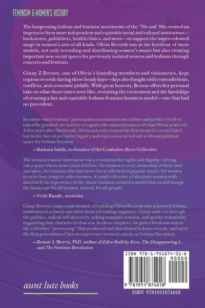 Foreword INDIES 2020 Silver Award Winner in LGBTQ+ Nonfiction Independent Press Awards 2021 Winner in LGBTQ nonfiction  Golden Crown Literary Awards 2021 Nonfiction Winner The burgeoning lesbian and feminist movements of the '70s and '80s created an impetus to form more independent and equitable social and cultural institutions-bookstores, publishers, health clinics, and more—to support the unprecedented surge in women's arts of all kinds. Olivia Records was at the forefront of these models, not only recording and distributing women's music but also creating important new social spaces for previously isolated women and lesbians through concerts and festivals. Ginny Z. Berson, one of Olivia's founding members and visionaries, kept copious records during those heady days—days also fraught with contradictions, conflicts, and economic pitfalls. With great honesty, Berson offers her personal take on what those times were like, revisiting the excitement and the hardships of creating a fair and equitable lesbian-feminist business model—one that had no precedent. In a time when lesbians' participation in mainstream culture and politics is often  taken for granted, we need to recognize the miraculousness of what Olivia achieved. A few years after Stonewall, Olivia not only created the first women’s record label, but in the face of pervasive bigotry and repression carved out a vibrant political space for lesbian freedom. —Barbara Smith, co-founder of the Combahee River Collective The women’s music movement was a revolution for rights and dignity, carving out  a space where none existed before: for women to seize ownership of their own  narrative, for lesbians who had never been reflected in popular music, for women to write love songs to other women. A small collective of idealistic women with  absolutely no experience in the music business created a model that would change the landscape for all women, indeed, for all people. —Vicki Randle, musician Ginny Berson’s important memoir of building Olivia Records into a beloved lesbian institution is a timely narrative from a founding organizer. Ginny walks us through the politics, radical self-discovery, aching romantic tension, and quirky community organizing that characterized an era. In these chapters, we gain a front row seat to the collective "processing" that produced and distributed lesbian records, and meet the first generation of fans to experience women’s music as lesbian liberation. —Bonnie J. Morris, PhD, author of Eden Built by Eves, The Disappearing L, and The Feminist Revolution