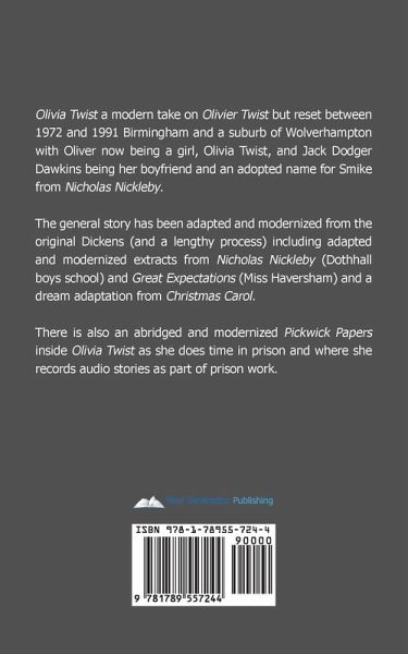 Olivia Twist a modern take on Olivier Twist but reset between 1972 and 1991 Birmingham and a suburb of Wolverhampton with Oliver now being a girl, Olivia Twist, and Jack Dodger Dawkins being her boyfriend and an adopted name for Smike from Nicholas Nickleby. The general story has been adapted and modernized from the original Dickens (and a lengthy process) including adapted and modernized extracts from Nicholas Nickleby (Dothhall boys school) and Great Expectations (Miss Haversham) and a dream adaptation from Christmas Carol. There is also an abridged and modernized Pickwick Papers inside Olivia Twist as she does time in prison and where she records audio stories as part of prison work.
