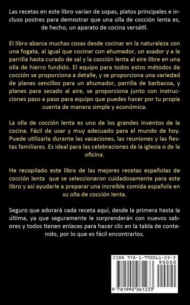 Las recetas en este libro varían de sopas, platos principales e incluso postres para demostrar que una olla de cocción lenta es, de hecho, un aparato de cocina versátil. El libro abarca muchas cosas desde cocinar en la naturaleza con una fogata, al igual que cocinar con ahumador, un asador y a la parrilla hasta curado de sal y la cocción lenta al aire libre en una olla de hierro fundido. El equipo para todos estos métodos de cocción se proporciona a detalle, y se proporciona una variedad de planes sencillos para un ahumador, parrilla de barbacoa, y planes para secado al aire, se proporciona junto con instrucciones paso a paso para equipo que puedes hacer por tu propia cuenta de manera simple y económica. La olla de cocción lenta es uno de los grandes inventos de la cocina. Fácil de usar y muy adecuado para el mundo de hoy. Puede utilizarla durante las vacaciones, las reuniones y las fiestas familiares. Es ideal para las celebraciones de la iglesia o de la oficina. He recopilado este libro de las mejores recetas españolas de cocción lenta que se seleccionaron cuidadosamente para este libro y así ayudarle a preparar una increíble comida española en su olla de cocción lenta. Seguro que adorará cada receta aquí, desde la primera hasta la última, ya que seguramente le sorprenderán con nuevos sabores y todos tienen enlaces para hacer clic en la tabla de contenido, por lo que es fácil encontrarlos.