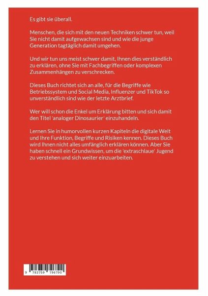 Es gibt sie überall. Menschen, die sich mit den neuen Techniken schwertun, weil Sie nicht damit aufgewachsen sind und wie die junge Generation tagtäglich umgehen. Und wir tun uns meist schwer damit, Ihnen dies verständlich zu erklären, ohne Sie mit Fachbegriffen oder komplexen Zusammenhängen zu verschrecken. Dieses Buch richtet sich an alle, für die Begriffe wie Betriebssystem und Social Media, Influenzer und TikTok so unverständlich sind wie der letzte Arztbrief. Wer will schon die Enkel um Erklärung bitten und sich damit den Titel 'analoger Dinosaurier' einzuhandeln. Lernen Sie in humorvollen kurzen Kapiteln die Digitale Welt und Ihre Funktion, Begriffe und Risiken kennen. Dieses Buch wird Ihnen nicht alles umfänglich erklären können. Aber Sie haben schnell ein Grundwissen, um die 'extraschlaue' Jugend zu verstehen und sich weiter einzuarbeiten.